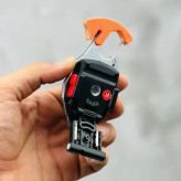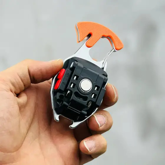 در کنار قسمت کارابین شکل یا همان گیرهی آویز چراغ، یک تیغهی کوچک طراحی شده است. این تیغه داخل بدنه جای داده شده است و خطری ندارد؛ اما میتوان با وارد کردن طناب و بند به محفظهی تیغه، آنها را برش داد.