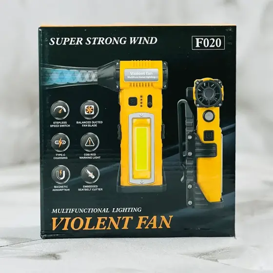 فن دستی وایولنت فن F020 یک جت فن پرقدرت چندکاره است که کاربردهای زیادی مثل گردگیری خانه و روی میز و ماشین و داخل موتور و …، روشن کردن زغال، جمع کردن برگ های خشک، روشن کردن آتش و … دارد. همچنین دو عدد چراغ قوی دارد که می توانید در کمپ و … از آن برای روشنایی استفاده کنید. یک چراغ ال ای دی پرنور که دارای چهار حالت 1. پرنور 2. کم نور 3. قرمز و 4. قرمز چشمک زن در بغل دستگاه و یک چراغ کوچکتر در جلوی دستگاه که سه حالت 1. پرنور 2. کم نور و 3. چشمک زن دارد. این جت فن دارای 4 سری مختلف است که حالت های مختلف باددهی ایجاد میکند و برای جاهای مختلف کاربردهای گوناگونی دارد. در زیر دستگاه نیز 4 عدد مگنت کار شده که قابلیت چسبیدن به اشیای فلزی را دارد و به هیچ وجه نمی افتد. موتور براشلس این دستگاه باعث شده عمر بالایی داشته باشد، همچنین یک جریان هوا به سمت پایین دستگاه هدایت شده تا باد به این قسمت برسد و خنک کاری انجام شود. در کنار این فن دمنده یک کاتر کوچک نیز تعبیه شده است تا در مواقع ضرورت بتوان با آن بند یا طناب باریکی را برید. همچنین یک استند روی دستگاه وجود دارد که کلمپ کمری نیز دارد و به کمر نیز متصل می شود و برای حمل آن نیازی به گذاشتن آن در جیب یا کیف ندارید و به راحتی با خود حمل می کنید. جت فن Violent Fan دارای ولوم تنظیم سرعت است و می توانید بسته به نیازتان سرعت و قدرت آن را تنظیم کنید و در کنار آن نیز 4 چراغ آبی رنگ نشانگر شارژ وجود دارد که هرکدام 25 درصد از میزان شارژ را نشان می دهند. قدرت و سرعت دستگاه به حدی است که اگر آن را روی یک میز بگذارید سر جای خود نمی ایستد و اطراف خود می چرخد.