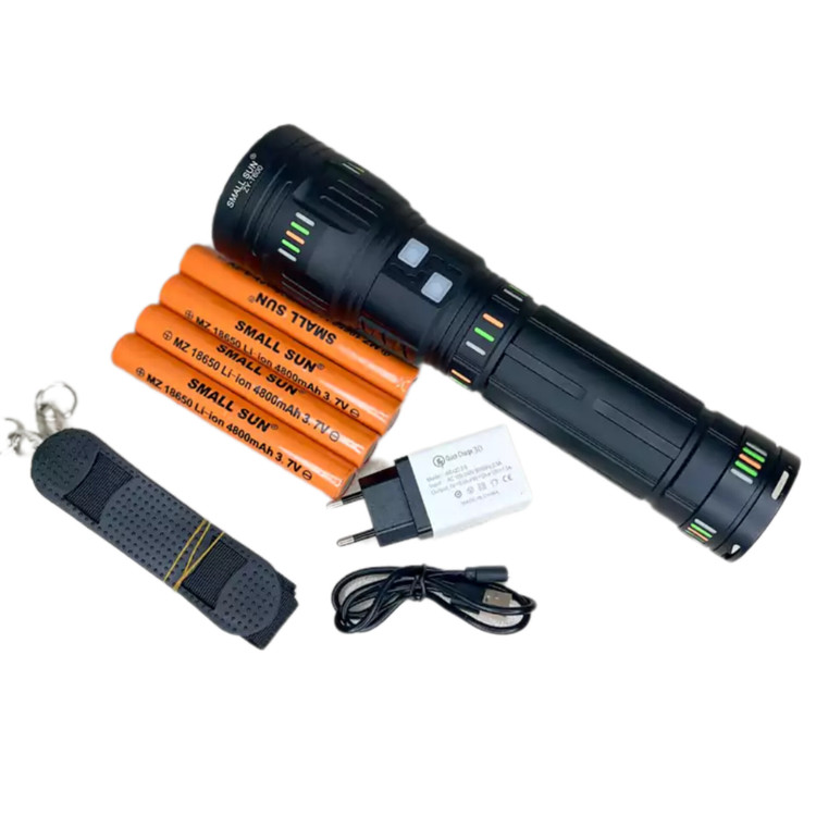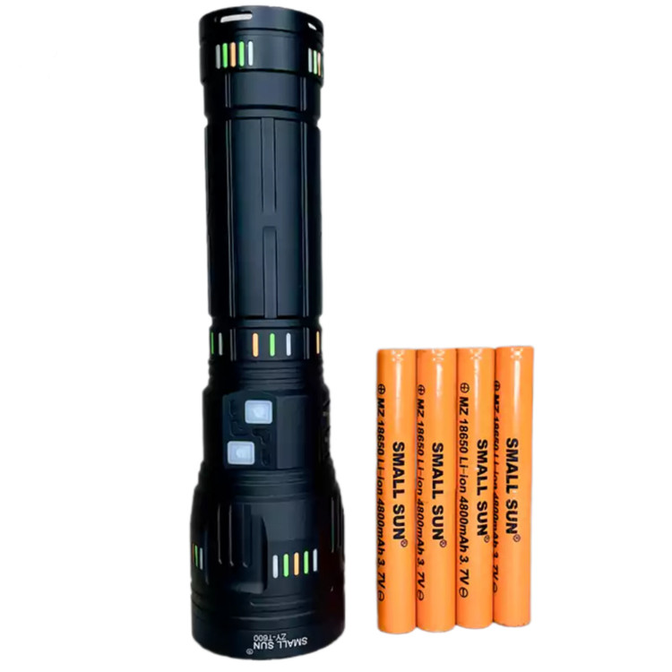 این چِراغ قوه مانند سایر چراغ قوهها دارای سه حالت نوردهی میباشد. همچنین با دارا بودن قابلیت تنظیم کانون، میتوانید تمام نور آن را به صورت دقیق روی هدف متمرکز نمایید. وجود یک عدد لامپ LED در آن سبب مصرف بهینه انرژی و طول عمر باتری میشود. چراغ قوه اسمال سان مدل Zy-t600 قدرت روشنایی به اندازه 5000 لومن با برد نوری 1000 متر دارد. وجود چهار عدد باتری لیتیومی میتواند ظرفیت کل 18650 میلیآمپر تولید نماید