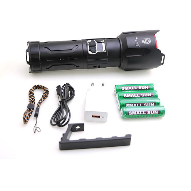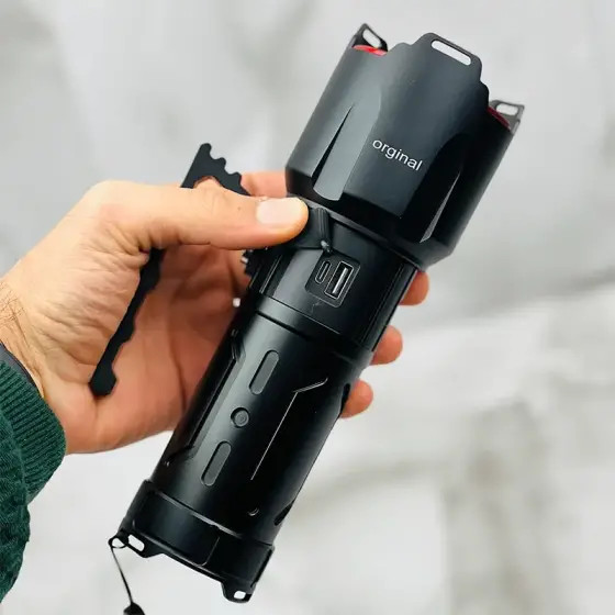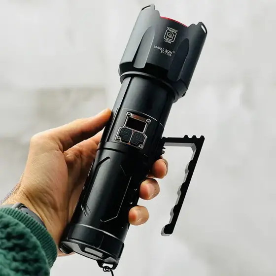 چراغ قوه زومدار اسمال سان مدل zy-t709 با برد نور 1000 متر می باشد و دارای 4 حالت نوردهی می باشد . و با قدرت روشنایی 4500 لومن می باشد . و با قابلیت زوم که واضح 1000 متر رو میزند و در حالت پخش نوری 200 تا 400 متر را کاملا روشن می کند . و دارای صفحه نمایشگر شارژ میباشد که دقیقا نشان می دهد درصد شارژ چراغ قوه چقدر باقی مانده و وقتی که درصد شارژ چراغ قوه به 20 درصد آمد حتما حتما باید به شارژ بزنید و تا 100 درصد کامل کامل شارژ بشود و برای این لازم است حداقل 2 کامل کامل به شارژ وصل شده باشد . و این چراغ قوه دارای 2 تا دکمه پاور یکی برای عوض کردن حالت های نوردهی و یکی فقط برای روشن کردن حالت چشمک زن می باشد . و این چراغ قوه اسمال سان مدل zy-t709 دارای 4 عدد باتری اصلی هک شده اسمال با سایز 18650 2400 میلی آمپر رنگ سبز می باشد . و اقلام این چراغ قوه : یک عدد دکمه یدک ، ورینگ و کش و غیره میباشد و باتری های این چراغ قوه حداقل تا نزدیک به 4 سال کار میکنند و هیچ عیب و ایرادی پیدا نمیکنند . و این چراغ قوه حتی اگر کم ازش استفاده کنید باید طوی 1 ماه باید حداقل 1 بار به شارژ بزنید چون برای سلامتی باتری و خود چراغ قوه خیلی خوب می باشد . برای اینکه این چراغ قوه زیباتر رونمایی بشود و طرافدار های بیشتر و جذب کند تو کارخانه برای این چراغ قوه از یک کیف حمل فوقالعاده محکم از مدل کیف حمل مدل کیف برزنتی استفاده کرده اند و حتی جعبه خود چراغ قوه خیلی جذاب و خیلی هم محکم می باشد .