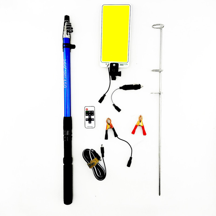 چراغ روشنایی کمپینگ لایت تلسکوپی که به آن چراغ لنسری یا ماهیگیری (Fishing Light) نیز گفته می شود وسیله ای مناسب جهت کمپینگ، مسافرت، لامپ تعمیر خودرو، روشنایی فضای باز و محیط های تاریک می باشد. .چراغ کمپینگ با ریموت کنترلی که دارد یکی از محصولات پرطرفدار و پرکاربرد برای کسانی که قصد سفر و کمپینگ دارند به حساب می رود. پایه این چراغ که یک لنسر سبک است بصورت تلسکوپی باز می شود و تا ارتفاع 5 متر قابلافزایش و از استحکام قابل قبولی برخوردار است. یکی از مزایای این چراغ، پایه مستحکم قابل تنظیم در قسمت زیر آن می باشد که قادر است در زمین فرو رود و لنسر درون آن قرار گیرد تا چراغ به حالت ایستاده استفاده شود کابل بلند این کمپینگ لایت به طور مستقیم و با دو گیره اتصال مخصوص؛ به باتری اتومبیل متصل می گردد. چراغ کمپینگ تلسکوپی با کنترل از راه دور ، به شما این امکان را میدهد تا در مواقع ضروری و یا در کمپ ها و همچنین پیک نیک های خود منبع نوری فوق العاده ای داشته باشید و با قابلیت افزایش ارتفاع آن می توانید نور را از بالا و در ارتفاع قرار دهید تا بیشترین فضای ممکن را روشن نمایید . با داشتن کنترل از راه دور ، برای کم کردن و یا خاموش و روشن نمودن دستگاه نیازی به نزدیک شدن به اتصالات و یا دستگاه نداشته و به راحتی و از راه دور آن را انجام خواهید داد .مدل light800 دارای پایه چسبونک و ال ای دی 800 وات می باشد